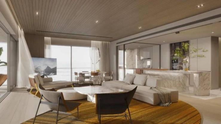 根据地域及环境的特点,模糊室内外的边界,营造一个开敞放松的空间,面像大海,与阳光融合交织,温暖且奔放。主材为暖色系,选用浅色木饰面,搭配大纹理的天然石材,自然且优雅。