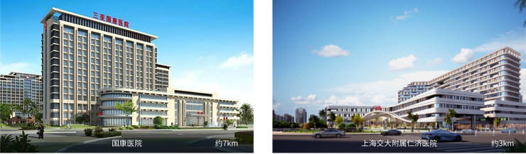 三甲医院国康医院,共1000张床位,现已投入使用;上海交通大学医学院附属仁济医院,定位海南最大公立三甲综合医院,预计2025年投入使用,健康无忧。