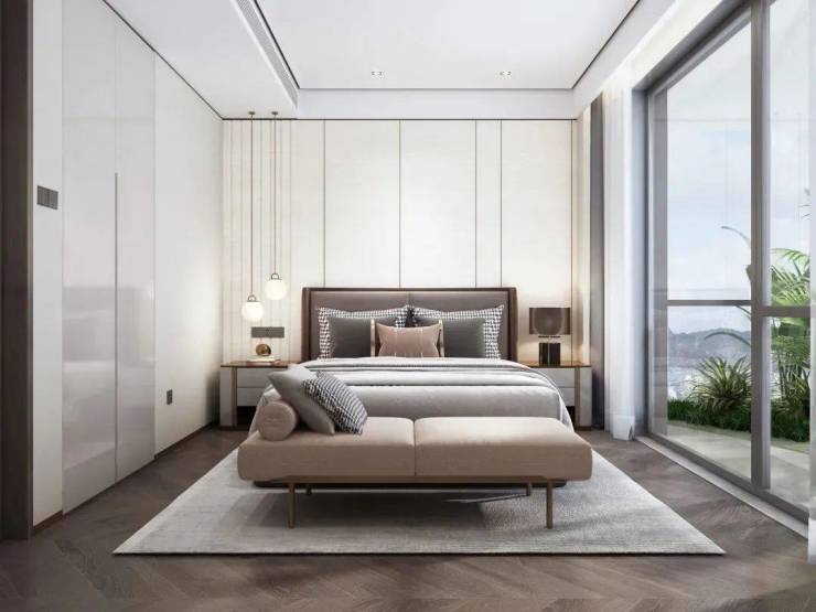 步入主卧套间,舒适的视觉尺度及生活维度无处不在。精选的材质、简约的布局与精致的配色,相得益彰,营造沉静深邃的氛围。