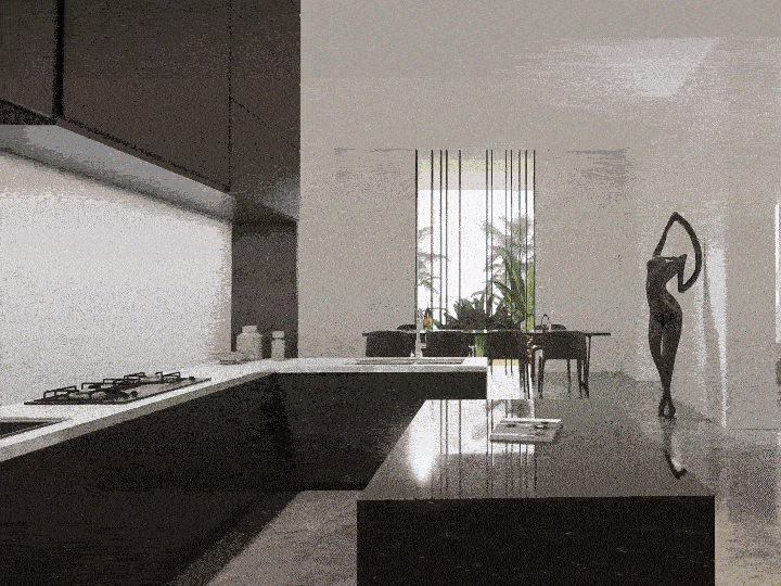 餐厅区与中岛吧台打通,与客厅链接成流畅、开放的格局,彰显出大平层的空间尺度。中岛吧台在去繁就简的基调中,以美为引,简约大气的几何造型吊灯与吧台造型相呼应,层次感与趣味性随即而出。台面安装上下水,杯具、水果和蔬菜可以分区清洗,节省走动距离。