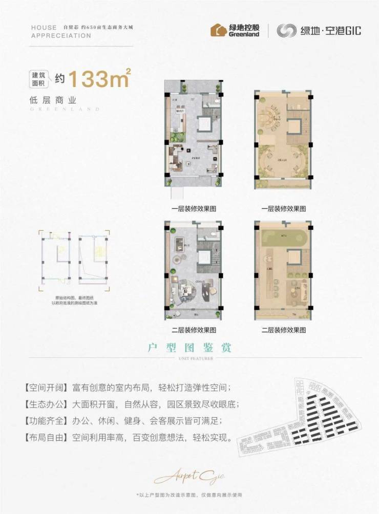 绿地空港GIC,建面约43-150㎡定制创办空间,灵动布局,各功能区均可实现;好房好价年终冲刺,抢占起飞型空港资产,轻松入驻自贸芯。