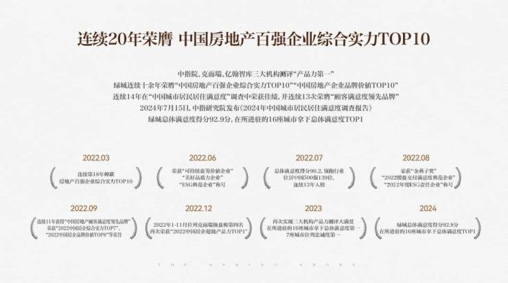 绿城历经30年的发展,绿城中国总资产规模超 5300 亿元,净资产规模超 1000 亿元,“绿城”品牌价值 1188 亿元,并连续20年荣膺“中国房地产百强企业综合实力TOP10”,绿城始终坚持对理想生活的追求,营造美丽建筑,创造美好生活。(信息来源:绿城官方,数据截至2025年1月)