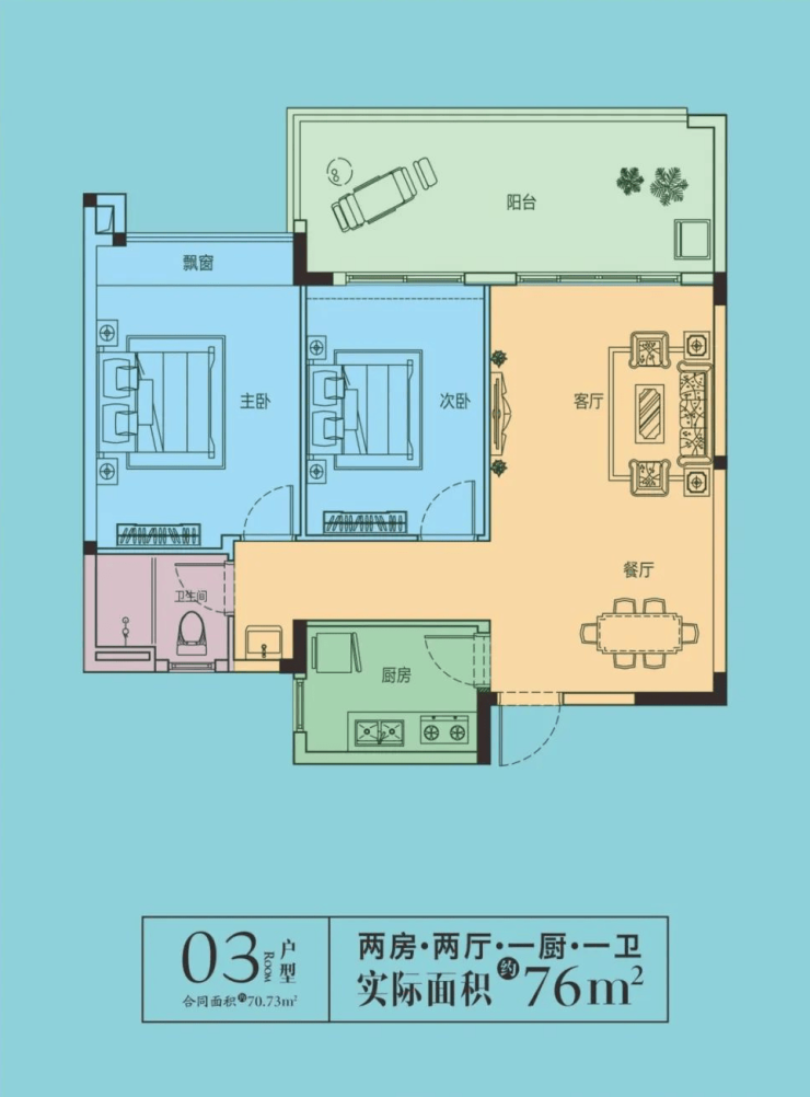 02、03户型:两房两厅一卫,三面都是朝景观面,5.8✖2.4的大阳台,客厅开间3.4米