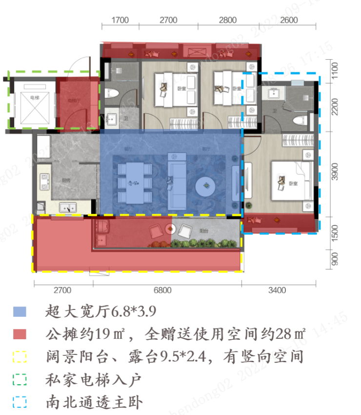 6.8-7.8米阔绰观景阳台,最大进深约2.8m,用自然装扮家的风景;约10.5米宽南向一体化客餐厨横厅,宽容生活缤纷时光。三房两卫,悠享度假时光。