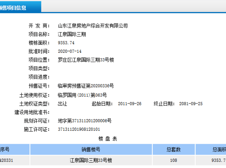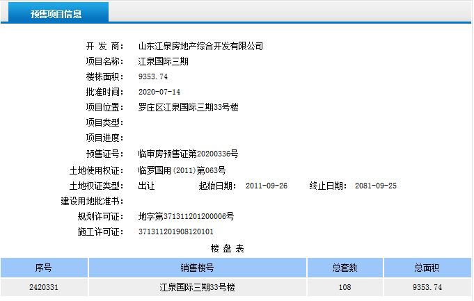 - 临审房预售证第20200336号 详情发证时间绑定楼栋罗庄区江泉国际三期33号楼证件照片