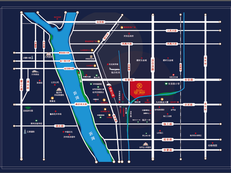 福泰·御河湾项目位于沃尔沃路与长安路交汇处是临沂市河东区国家级经济开发区的核心位置,距河东汽车站5分钟、距火车总站10分钟、距沂河湿地公园800米,零距离全国十大湿地公园李公河湿地公园,因此楼盘身处公园中,周边多条公交路线经过。