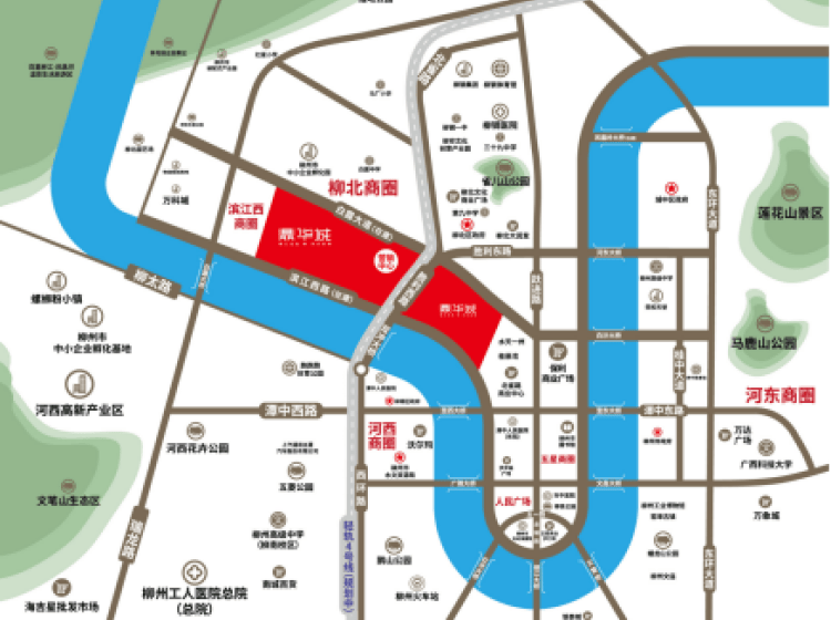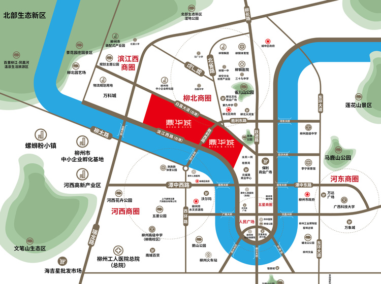 ·项目紧靠胜利西路、白露大道、前锋路等城市主路,快速直通柳钢商圈、大润发商圈、保利商圈,美食、购物、休闲即刻开始;滨江西路连接项目南侧,百里柳江画廊惬意江景尽收眼底,直通五星商圈,中心繁华轻松在握。
