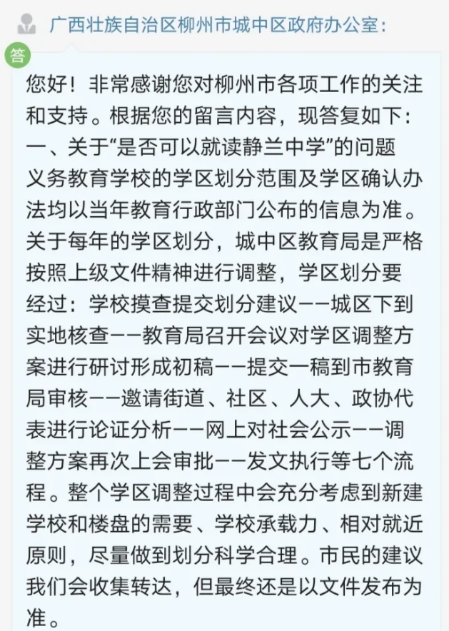 12月9日,广西壮族自治区柳州市城中区政府办公室就网友咨询的华润静兰湾小区学区问题进行了回复。