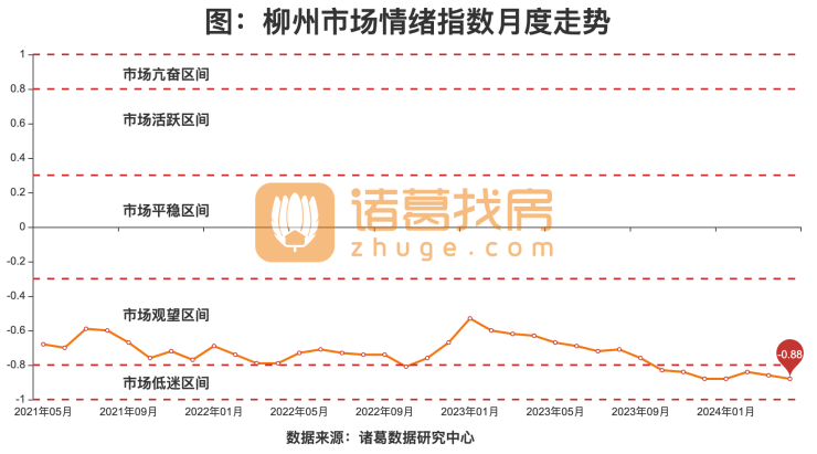 根据诸葛找房数据研究中心监测数据显示,2024年04月,柳州市场情绪指数为-0.88,较上月下降0.02,位于市场低迷区间。