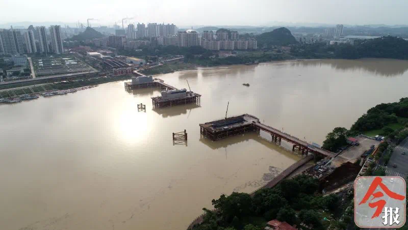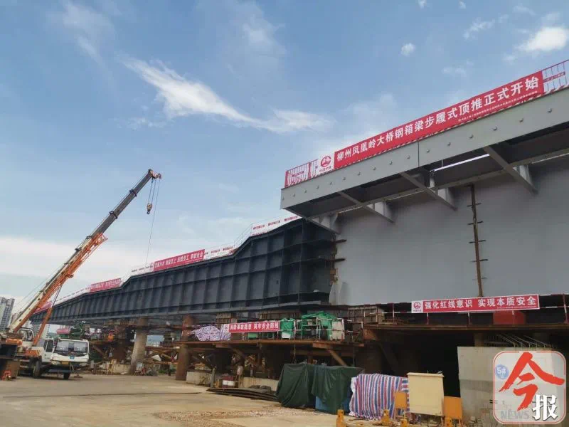 7月1日,柳州市凤凰岭大桥开始架梁,大桥钢箱梁采用的是步履式顶推。凤凰岭大桥为独特的风雨桥造型,也是世界上跨径较大、体量较大的跨江风雨桥。大桥主桥长700米,顶推单跨较大跨度为130米,这也是世界上跨径较大、单次顶进行程较大的步履式顶推方式。