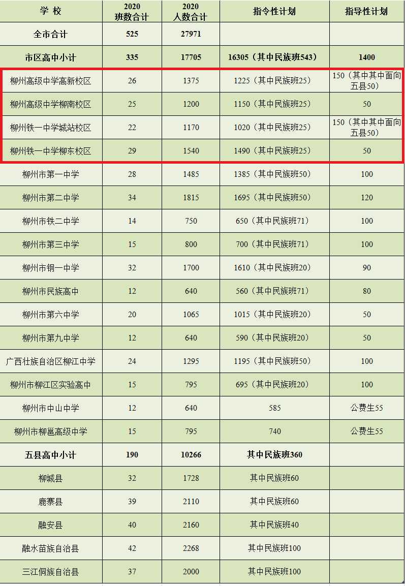 根据我市今年普通高中招生计划,柳州高级中学高新校区招录26个班1375人,柳州高级中学柳南校区招录25个班1200人,柳州铁一中学城站校区招录22个班1170人,柳州铁一中学柳东校区招录29个班1540人,市排名前列中学招录28个班1485人,市第二中学招录34个班1815人等。