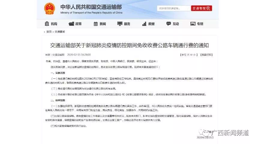 2月16日,记者从广西壮族自治区交通运输厅了解到,《新冠肺炎疫情防控期间广西免收收费公路车辆通行费工作方案》也即将实施。