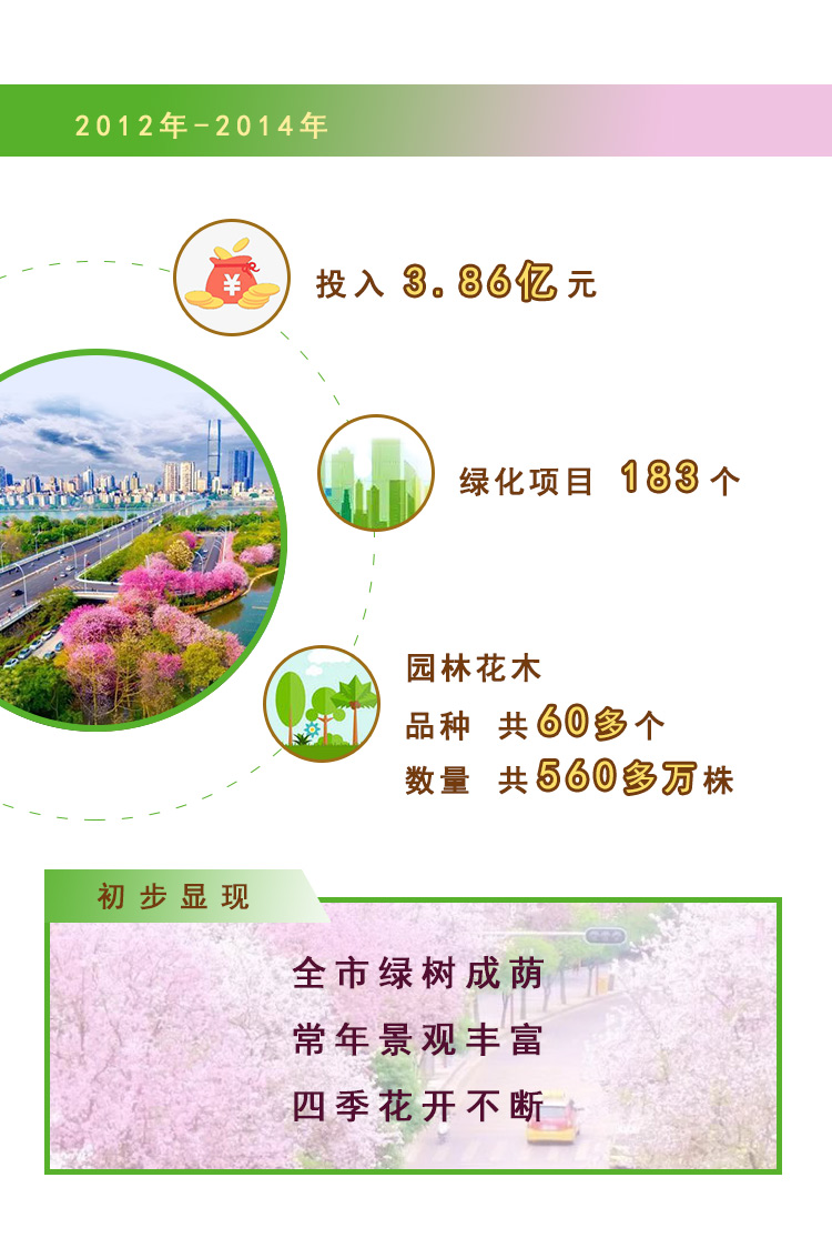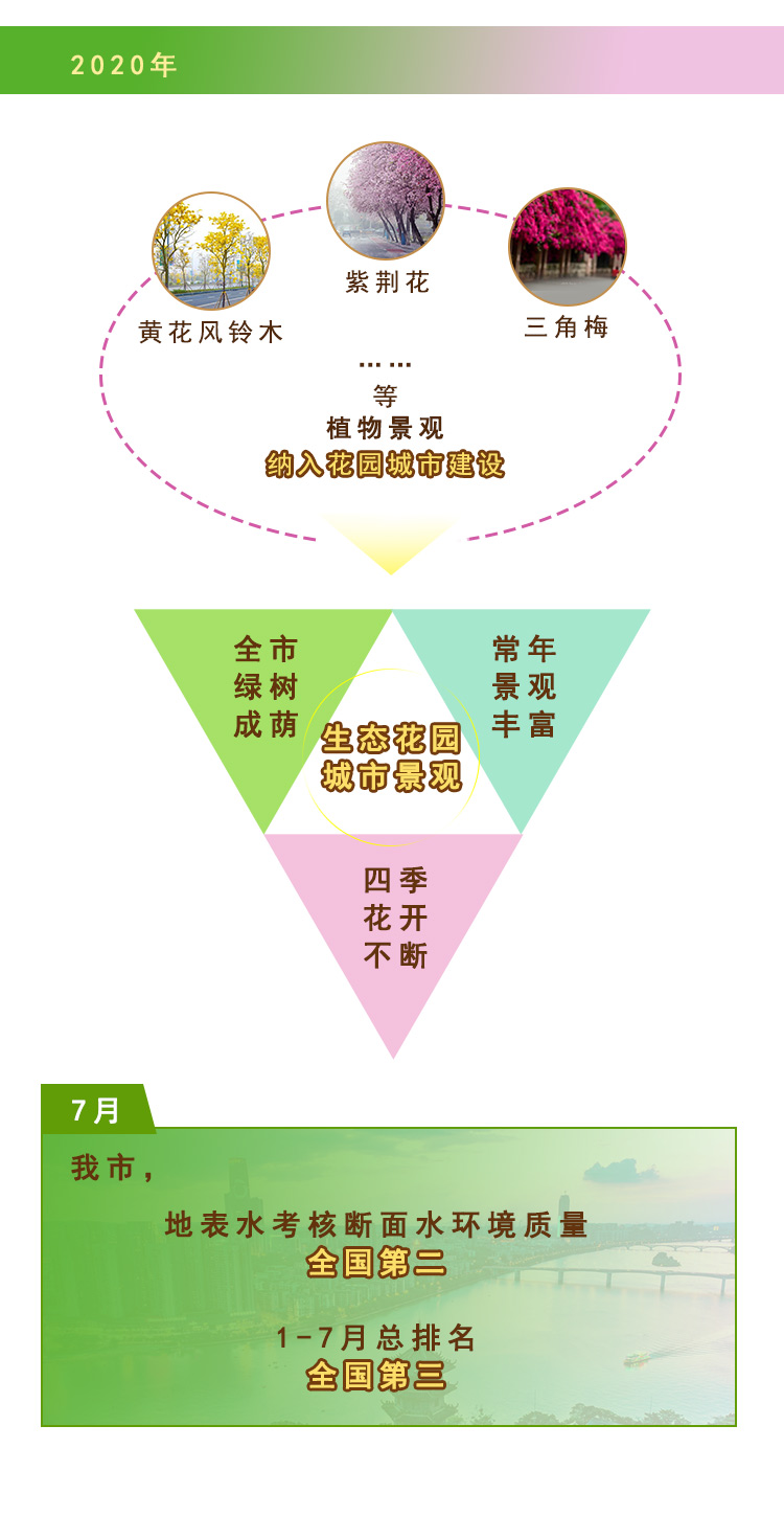 如今的柳州,一年四季花开不断,生态环境让人称赞,全市建成区绿化覆盖率达43.84%,森林覆盖率稳定在65%。如今,柳州的生态环境华丽转身,柳江河清澈见底,多项水上国际大赛经常落户柳州,城市公共绿地面积增大。生活在柳州,就像生活在一个宜居宜业的大公园。