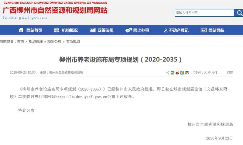为满足我市不断增加的老年人口的增长需求,9月23日,柳州市自然资源和规划局发布公告,对柳州主城区、北部生态新区、柳江中心区的养老设施布局规划进行补充和完善,规划期限为2020年-2035年,对象包括机构养老、社区养老、居家养老(不涉及养老地产)。