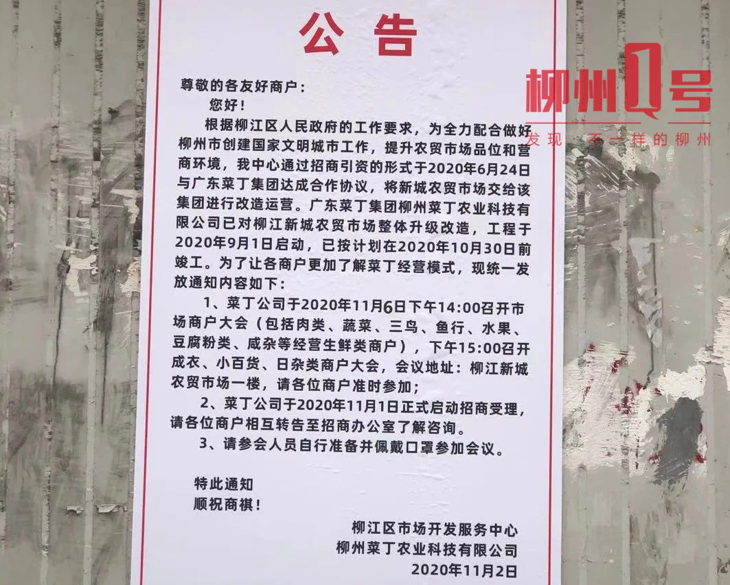 记者在棚子外侧看到一张日期为11月2日、落款是柳江区市场开发服务中心的搬迁公告。公告显示,目前新城农贸市场已经改造完成,原来的新城农贸过渡市场将在11月25日0:00进行拆除,未按要求搬离造成的损失商户自行负责。