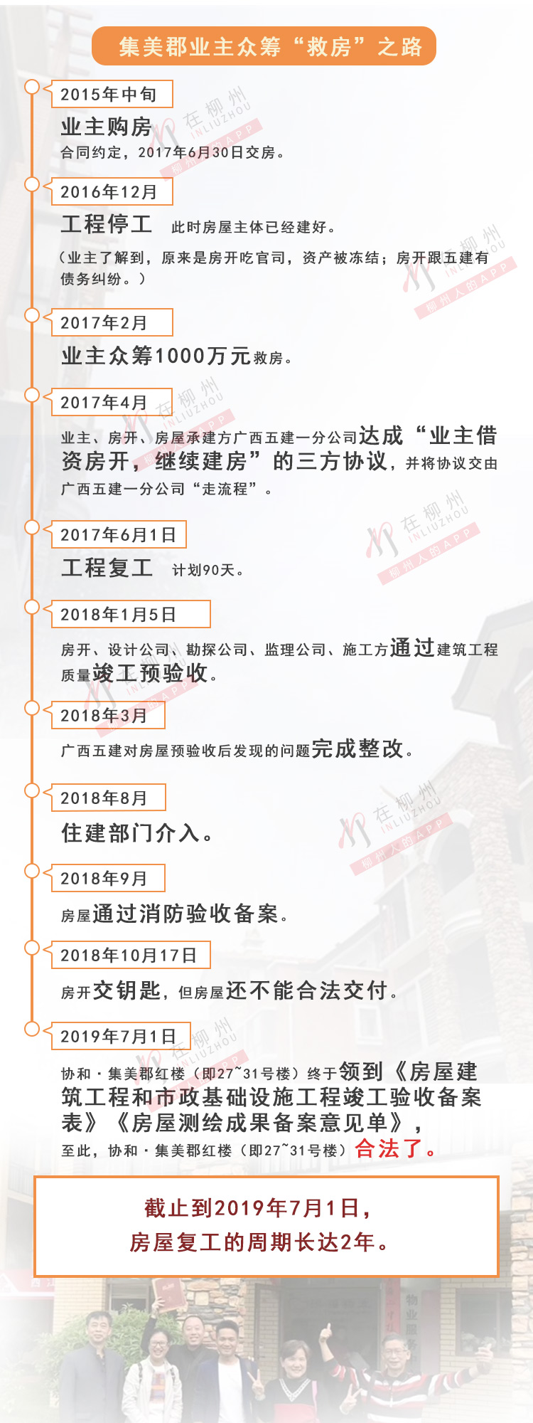 2017年5月,《在柳州》报道了协和家园·集美郡四期红楼的79户业主众筹自救“烂尾”楼一事,引发众人关注。这个本该在2017年就交付的楼盘,一度因开发商资金链断裂,以及开发商跟承建方闹纠纷而止步于竣工验收,而业主们在自救的道路上,也是一波三折。