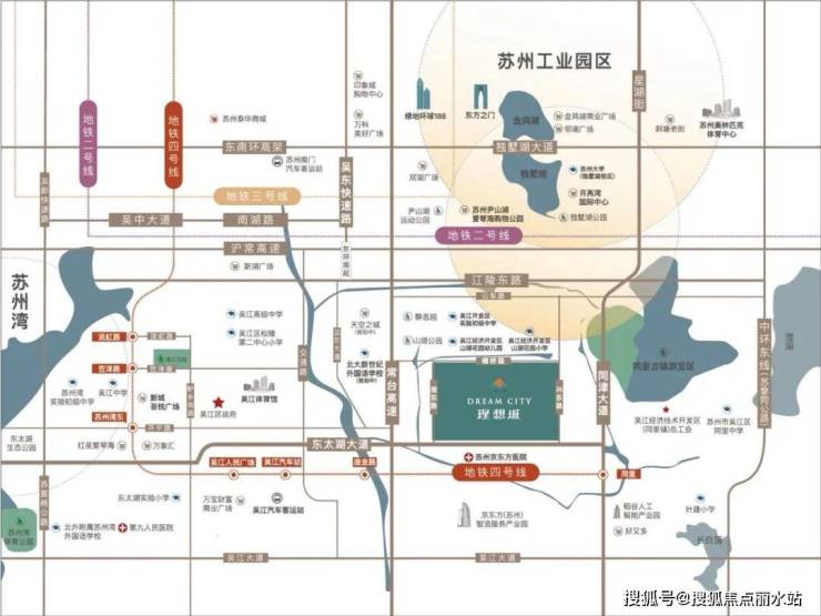 比如未来的南苏州新地标博洛尼天空之城,从绿地理想城开车快速就能到;沿着东太湖大道向西,到万宝广场、吾悦广场、万象汇等CBD核心也很方便。