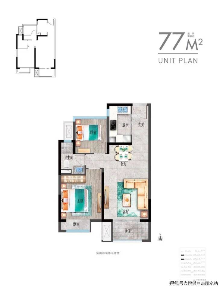 总价140万起、刚需首选、77㎡神户型、2室设计、动静分离、U型厨房、主卧有飘窗