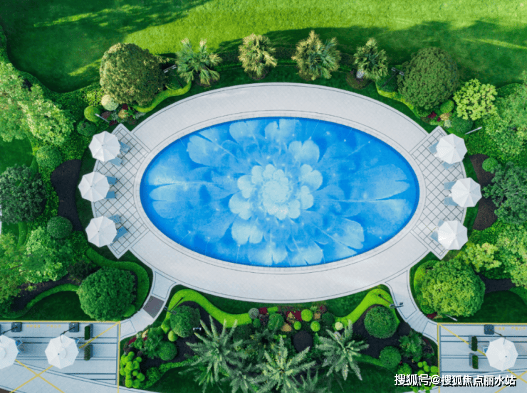 滨江华宅,以“蓝宝石”水系为经典标签。池底镶嵌约25万块马赛克,精妙绘制牡丹盛放图卷,尽显雍容华贵。周边环绕银海枣、美丽针葵等亚热带风情树种,交织成绿意盎然的画卷,层次错落有致。