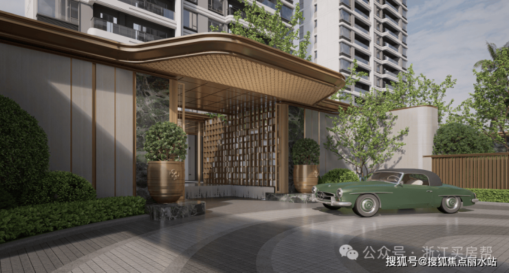 2、酒店式主入口和宴会厅式北入口:这样奢雅度假级的景观谁不喜欢,效果图里香槟金色的高奢酒店式主入口有约46米宽气派,这样奢华的归家门楼你想有吗?另外负责商务的小姐姐强调,他们特意挑选的是Prada绿奢石、香槟金色的铝板,都是为了彰显独特尊崇的归家品味;另外环岛的设计,让开车接送会客亲朋更加有酒店接待的星级格调;