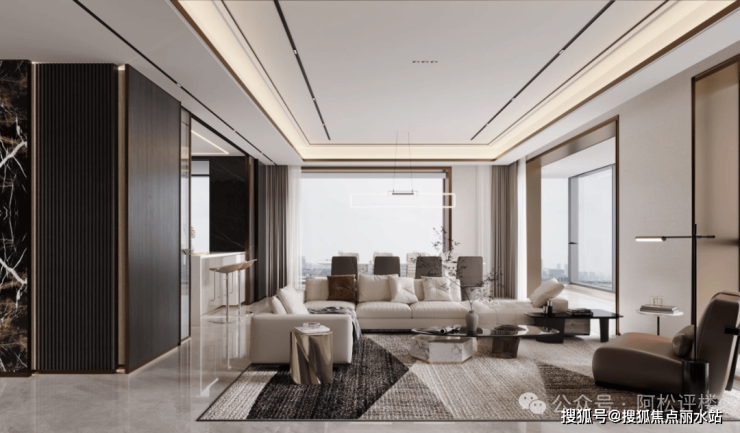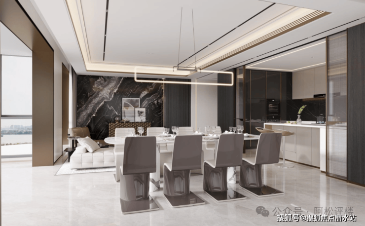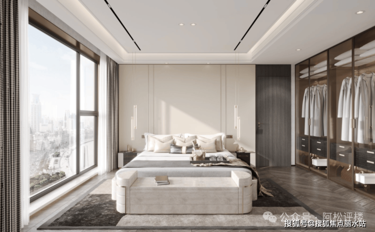 该户型呈现出来的观江体验是非常好的,一方面是南向看江,避免了江南大部分江景房舒适度与江景不可兼得的尴尬;另一方面,两个卧室躺在床上也能看江,甚至可以做到一边浴缸里沐浴,一边欣赏江景,非常奢侈。