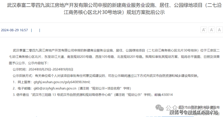 2024年8月29日,武汉市进行了武汉泰富二零四九滨江房地产开发有限公司申报的新建商业服务业设施、居住、公园绿地项目(二七沿江商务核心区北片30号地块)规划方案批前公示,即中信泰富滨江金融城的30号地块(包括住宅九玺和商办雍江荟)。