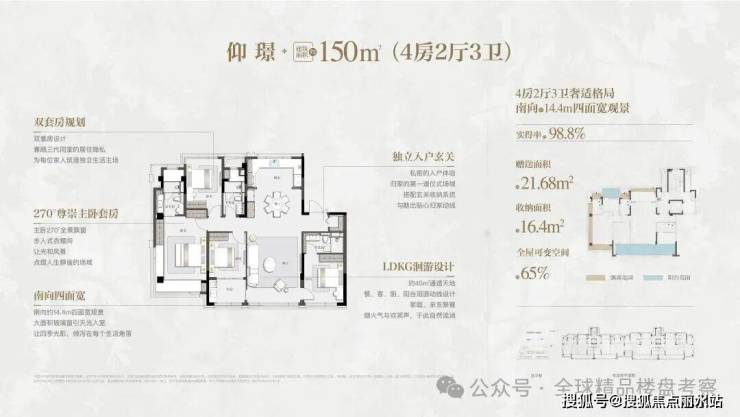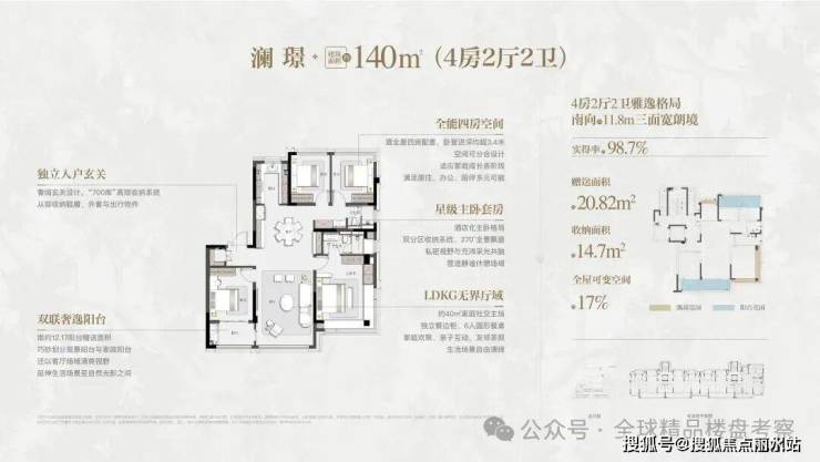 五厅格局创新:以近7米面宽横厅为核心,衔接约40㎡南向庭院,创造性地实现社交、休闲、娱乐的功能分离。