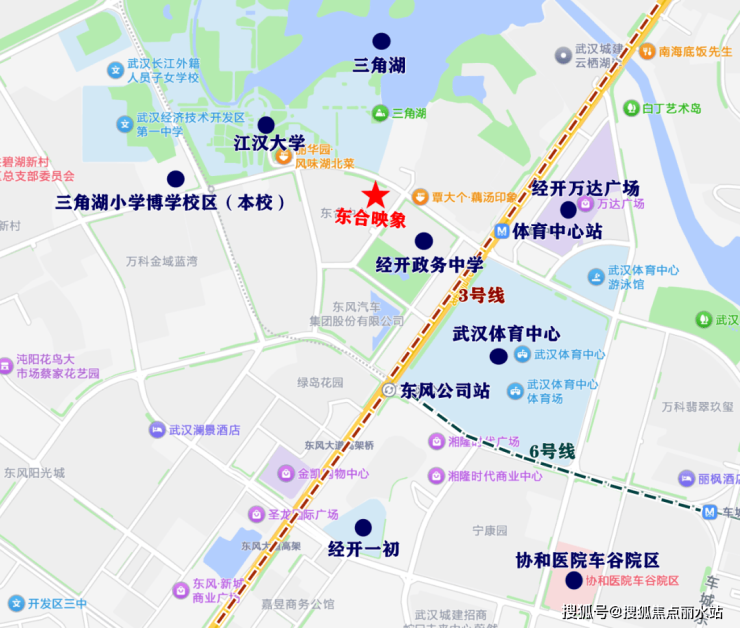 长江投开丨万科·东合映象北瞰江汉大学、三角湖,东挨经开区政务中心,再向东直线距离约400-500米,即武汉体育中心、以及经开万达