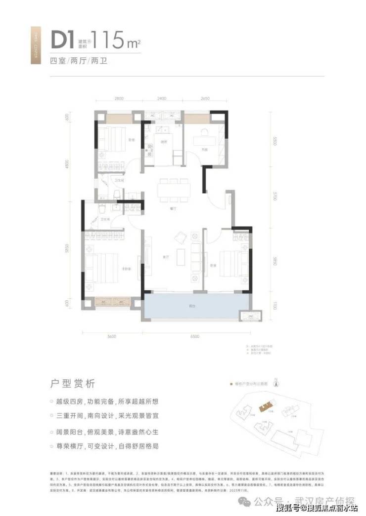 7、稀缺11层小高层:仅44套。115平/120平四房两厅两卫户型,超高得房率,公摊约16.65%,全房赠送飘窗。