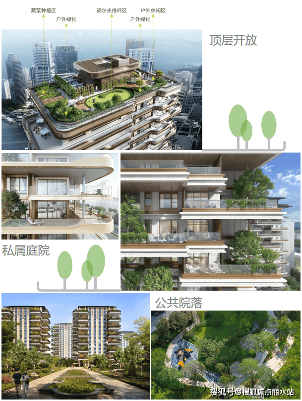 竖向造园,通过垂直绿化、共享大平层空中花园、屋顶绿化、住宅阳台绿植等建筑空间手法,营造高密度空间下生态舒适的建筑立体绿化系统,形成内部景观与垂直景观相互协调呼应的立体景观体系。