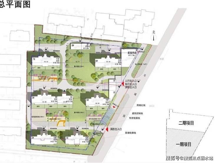 1、一期及二期地库合并设置,原有一期北侧车库口调整至二期用地北侧。