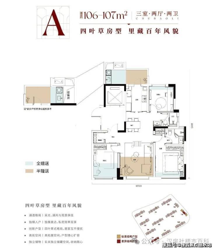 该户型位于2 号楼及 11 号楼,有独立的入户电梯厅,三开间朝南,西南面开间约10.5米,三个卧室均带全尺寸飘窗,100m²左右的功能性三房,适合刚需家庭。