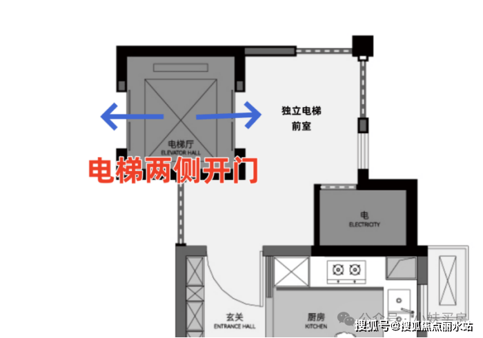 中间的两套96平户型通过贯穿式双开门电梯实现专梯入户的效果,并且还有独立的电梯前室可以利用,面积约9平米,空间不小。