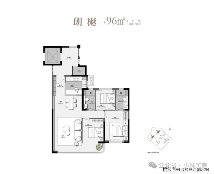得益于四代住宅的高得房率,金地大成乐府建面约96平户型做到了大三房两卫的格局