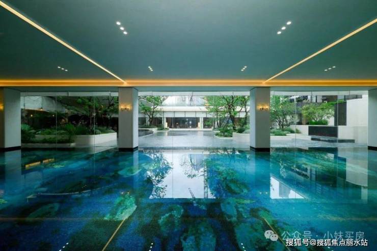 乐器线条元素的搭配,高落地玻璃形成的景观延伸,高端水循环系统,四季恒温的泳池空间
