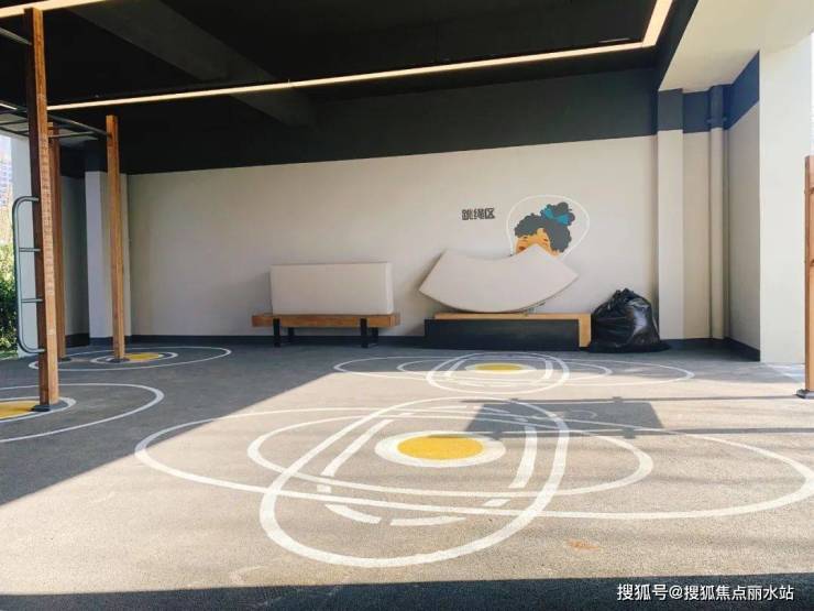 考虑到居住体验和多维社区体验,项目在 部分楼栋一楼设置架空层,现场可以看到有不少运动器械已经入场,墙面上各式各样的卡通图样也为空间增添了一份情趣。