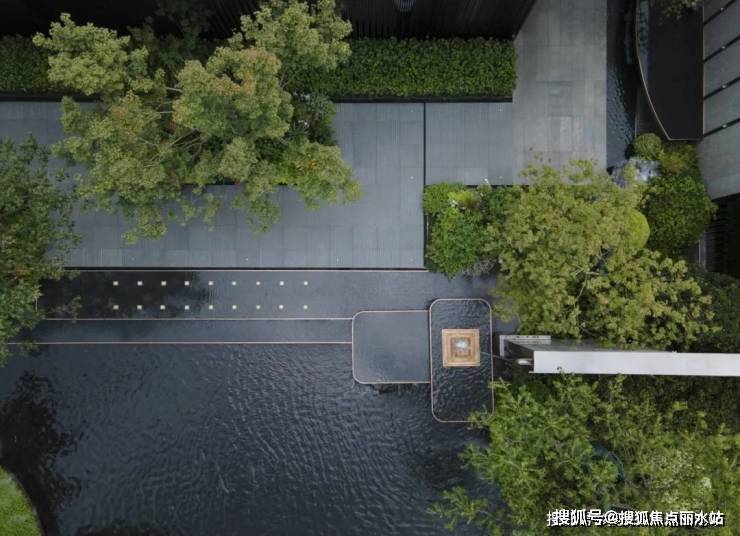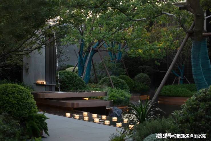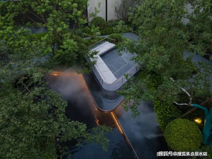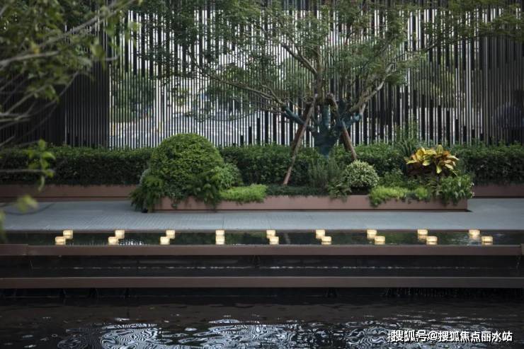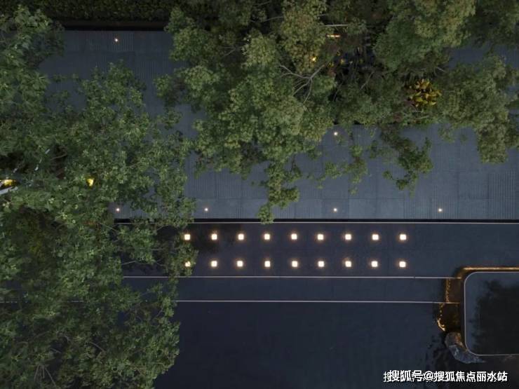城市的喧嚣在这一隅园林中被沉淀,天色低垂,一池澄澈水面映衬着水乡的灯火通明,设计将夜幕中的灯火点缀在景池中,如江南繁华初绽,繁星摇曳。