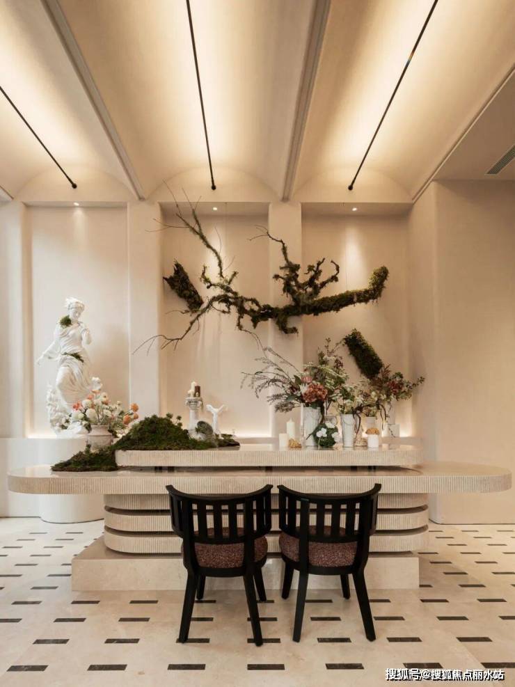 比如采用台地园理念设计的漂浮花园,既是空中会客厅,也是运河观礼台。从室内踏入到花园的瞬间,阶梯水景如琴键般错落抬升;两侧卷弧石材,仿佛画卷将整座花园勾勒半悬于空中。