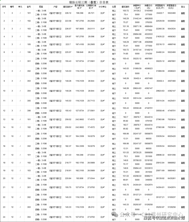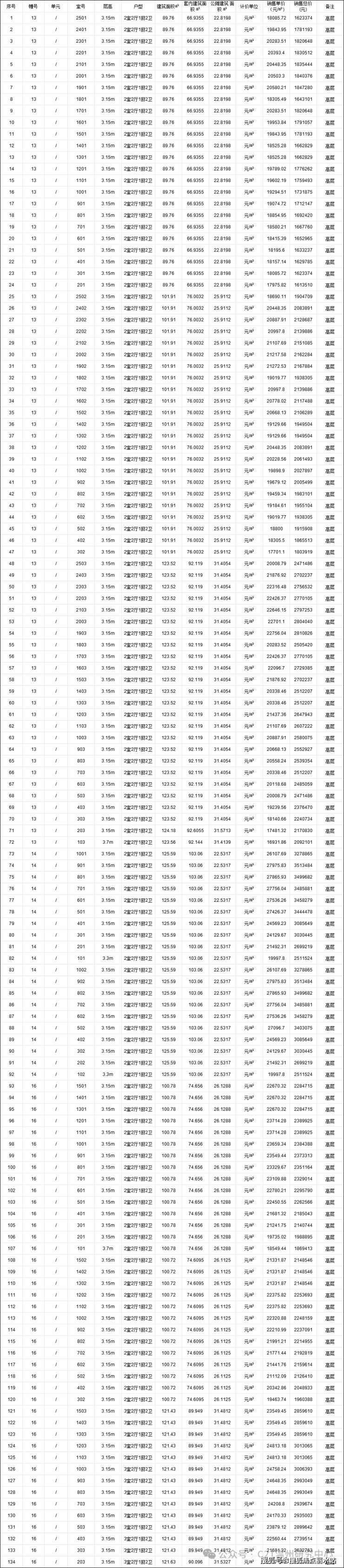 附一房一价表