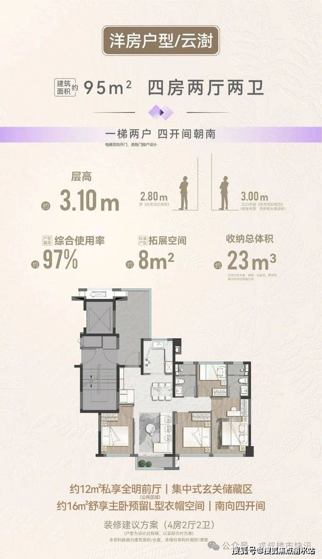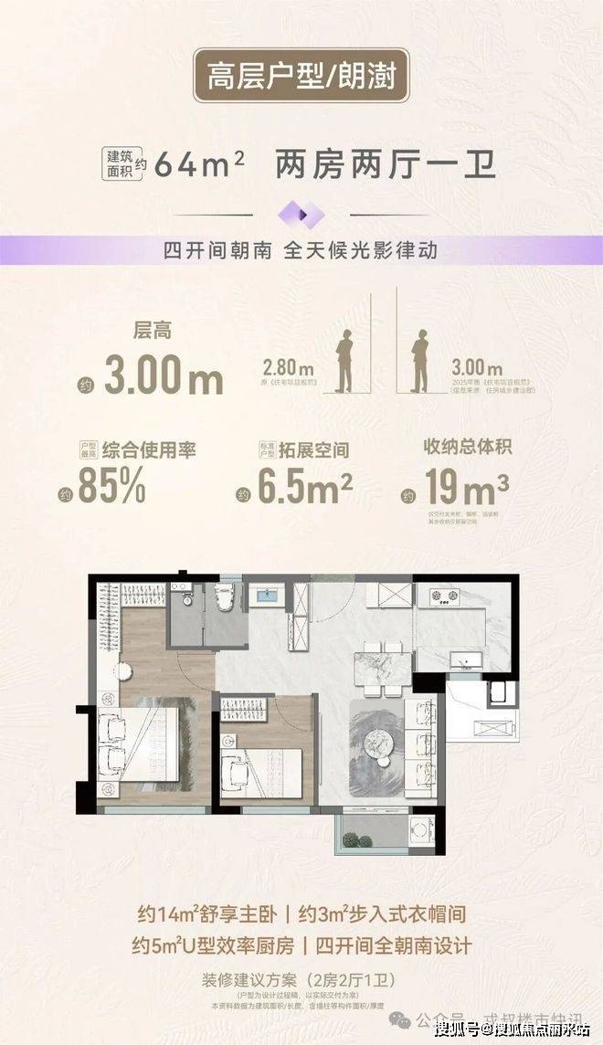 其中64㎡精装两房得房率85%,客厅卧室全朝南,主卧带衣帽间,顶配精装+智慧社区,主打小而精。