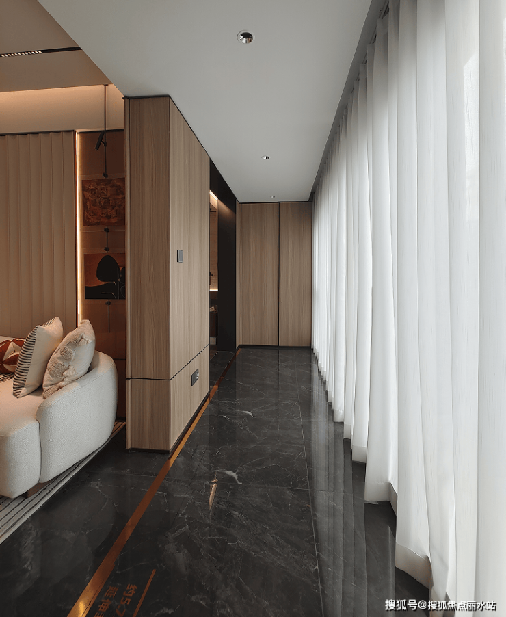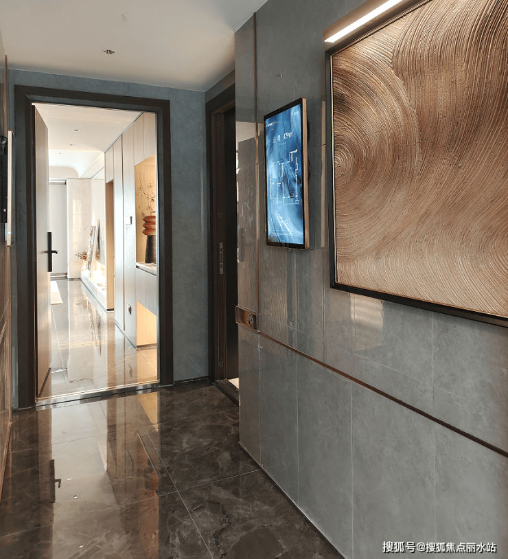项目部分公共区域也做了实景展示。现场看到,项目电梯间、公共过道等都做了高标准的装修,除了常规的吊顶之外,项目还在墙面做了金属线条造型,这些细节于业主是归家体验和尊贵感,于开发商是诚意、细节。