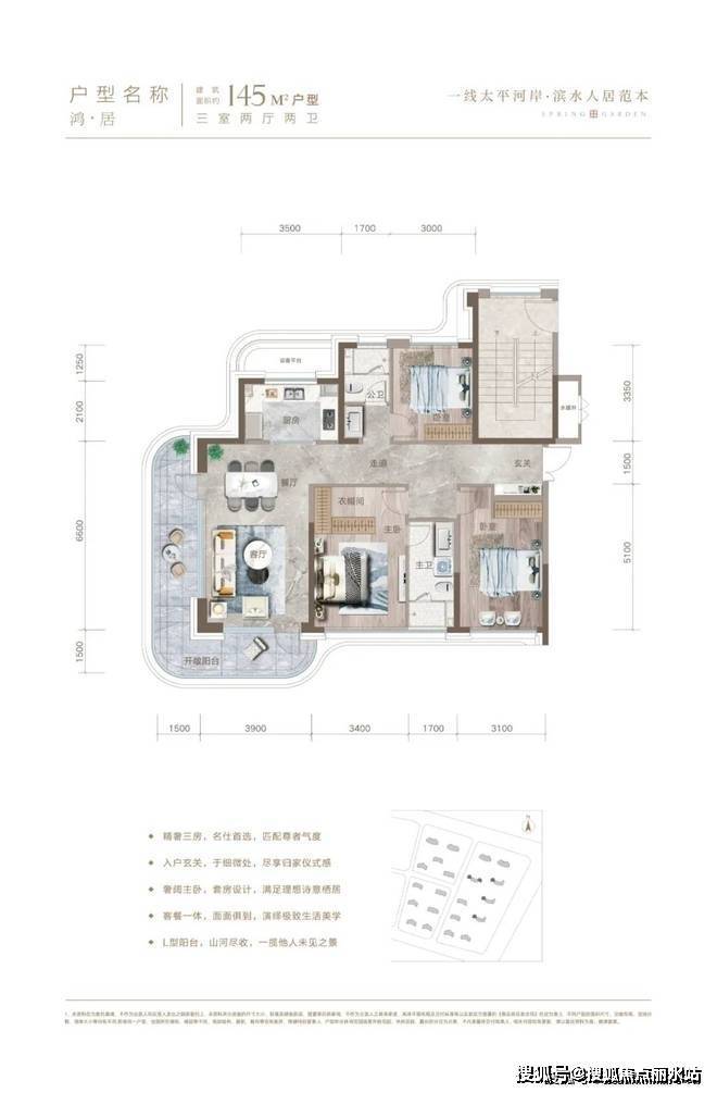 建筑面积145㎡,三室两厅两卫。精奢三房,名仕首选,匹配尊者气度。入户玄关,于细微处,尽享归家仪式感。奢阔主卧,套房设计,满足理想诗意栖居。客餐一体,面面俱到,演绎极致生活美学。L型阳台,山河尽收,一揽他人未见之景。