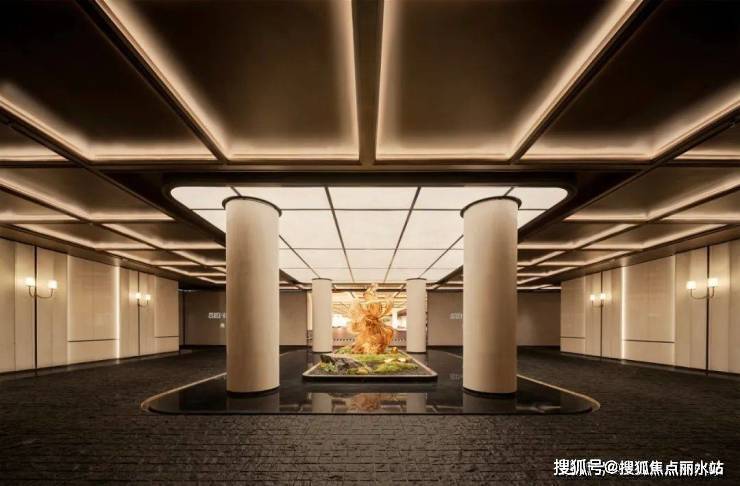 步入门庭,云石吊顶之下,借鉴中国古代建筑中的“藻井”做法,由522片皇家白玉石材拼接而成,凝聚光华,辉映时空。华光之下,中心水池承托起艺术雕塑,莹润皎洁,宛若珍宝。立面则采用铂金钻奢石,搭配墨绿荷塘月色奢石、安哥拉黑奢石花钵、以及手工锻造的巨幅铜门,流淌出一抹温润质感。