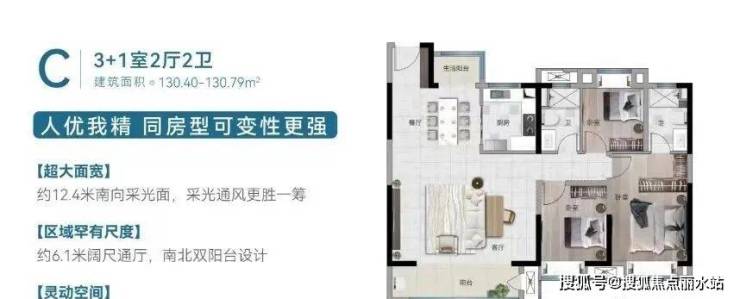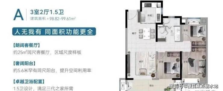 4、户型设计亮点十足,宽厅设计,尺度感十足:小区99㎡做了功能性齐全的3房1.5卫,还带有约5.6米大阳台!116㎡、130㎡户型都是5米以上的宽厅设计,空间十分阔绰!且130㎡还是3+1设计,全生命周期产品更有吸引力。