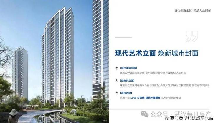 【项目本体】:本项目作为在汉口长江新区打造“语系”作品,楼体外立面采用经典米白色与深灰色,简约直线线条设计,典雅大气,与长江新区城市衬托,构筑城市天际线。以及采用降噪中空 LOW-E 玻璃,隔绝外部噪音,私享静谧居家生活。