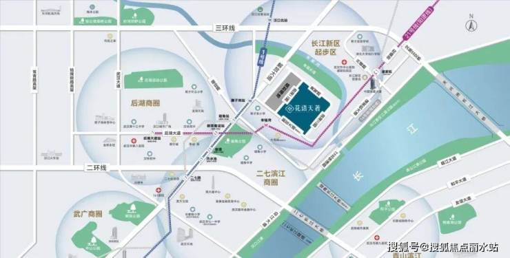 中国铁建·花语天著位于新区大道与游湖二路交汇处,在楼市划分上属于长江新城起步区,行政划分属于江岸区,距离三环线1.3公里,属于三环以内。