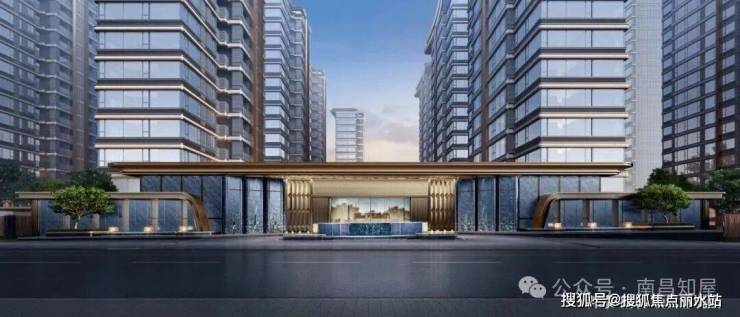 项目整体规划为 17 栋住宅,其中 3 栋为 23 至 26 层的高层,其余 14 栋为 16 至 17 层的小高层。小区东侧设有一处近 40 米宽的主入口大门,向内延伸有 3 个下沉庭院,其中一个为水系庭院,下沉庭院西侧、地块偏中央位置设有中央水景,形成东西向景观轴。建筑外立面采用公建化设计,南向全部封窗,每栋楼有金色线条装饰,山墙面有灰白色 + 线条装饰和玻璃面两种。