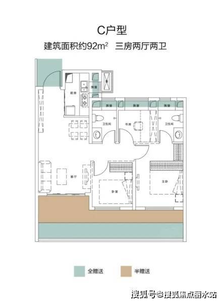 这个建面约92㎡的户型,虽是入门级户型,却是板块内唯一的百平以下双卫设计。