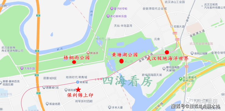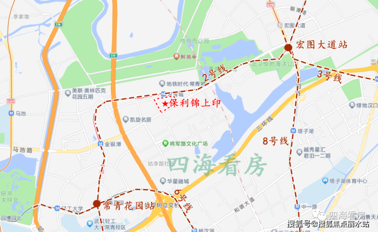 保利锦上印位于金银潭大道与将军二路交汇处,楼市划分属于金银潭板块,行政划分属于东西湖区。项目距离三环线约1.4公里,距离二环线约4.5公里,属于三环外。