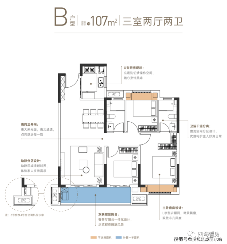 4、产品优势:项目户型设计起步107㎡,走的是初改路线,功能性齐全,同时公摊仅约22%,大阳台和多个飘窗设计可拓展空间多,实际得房率非常高。